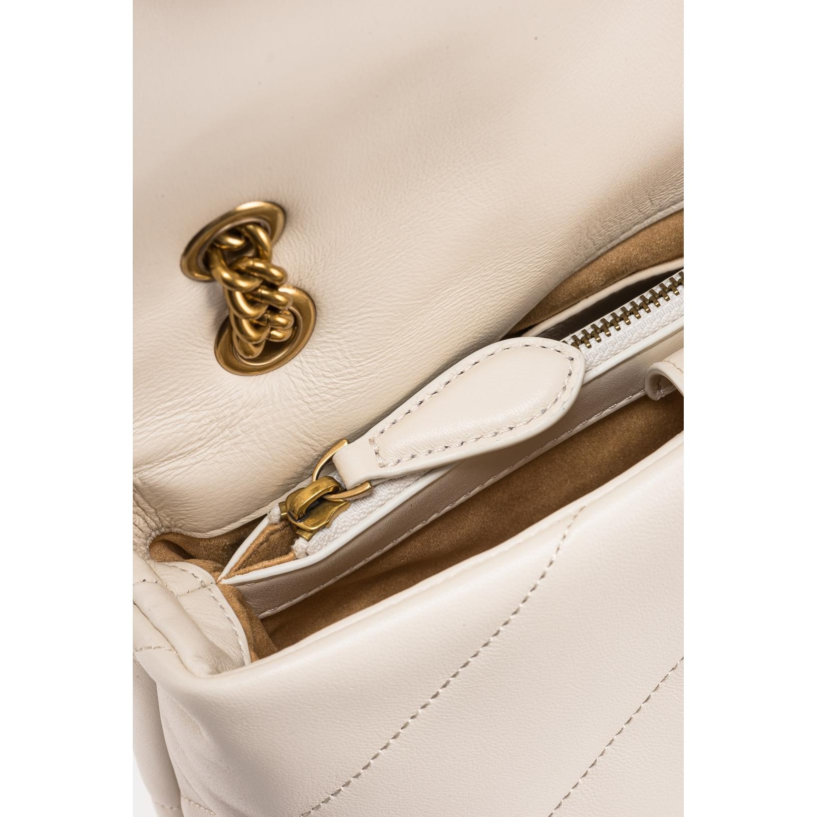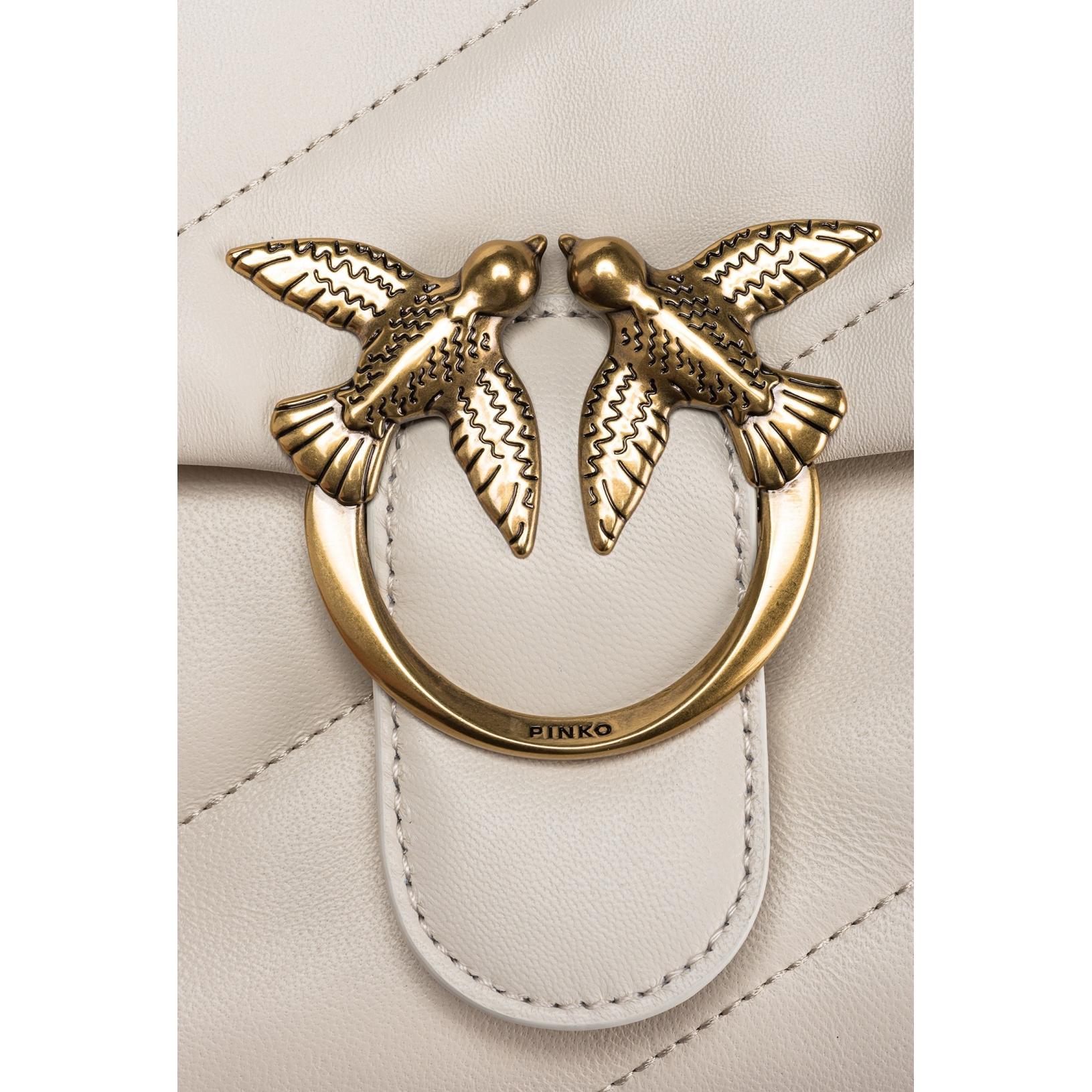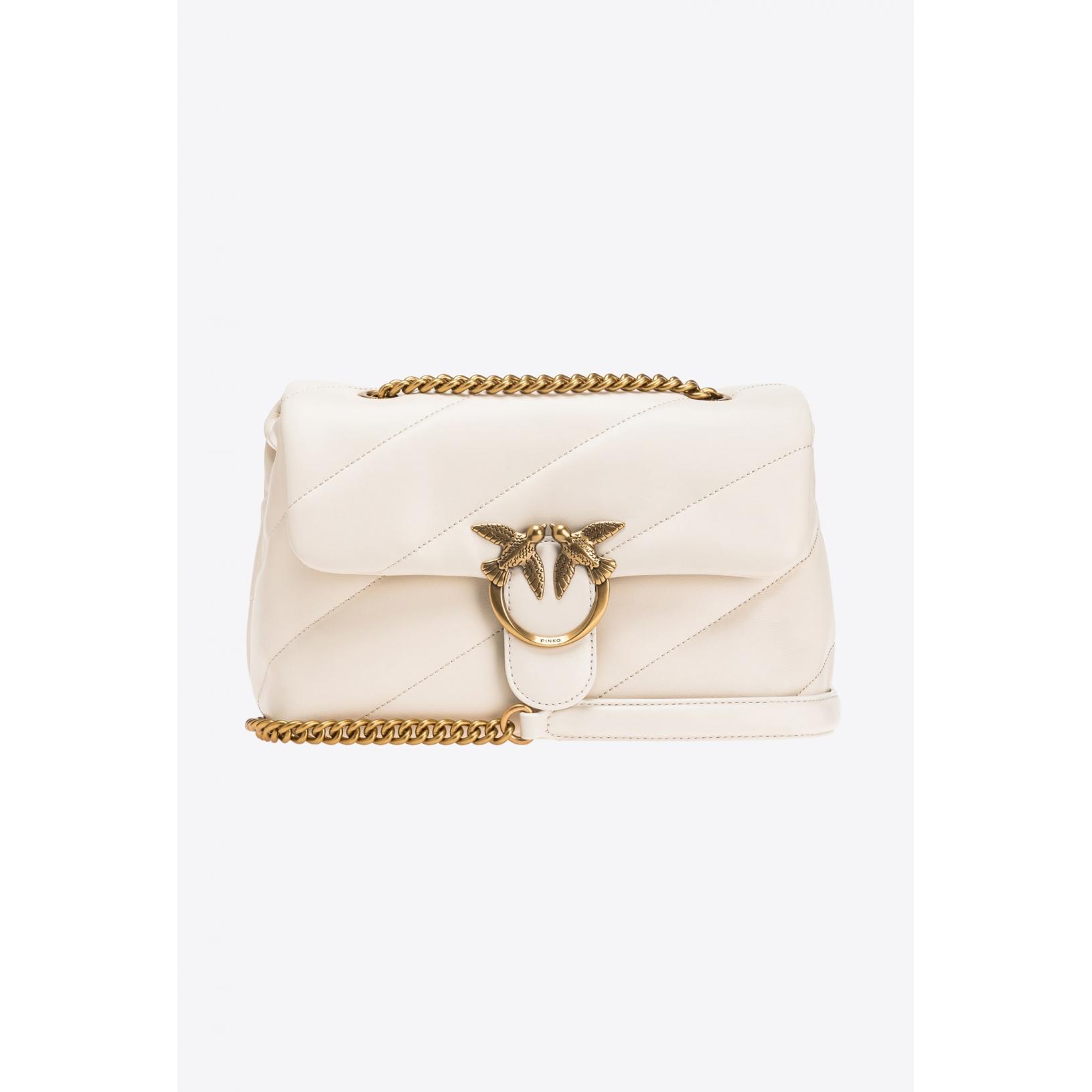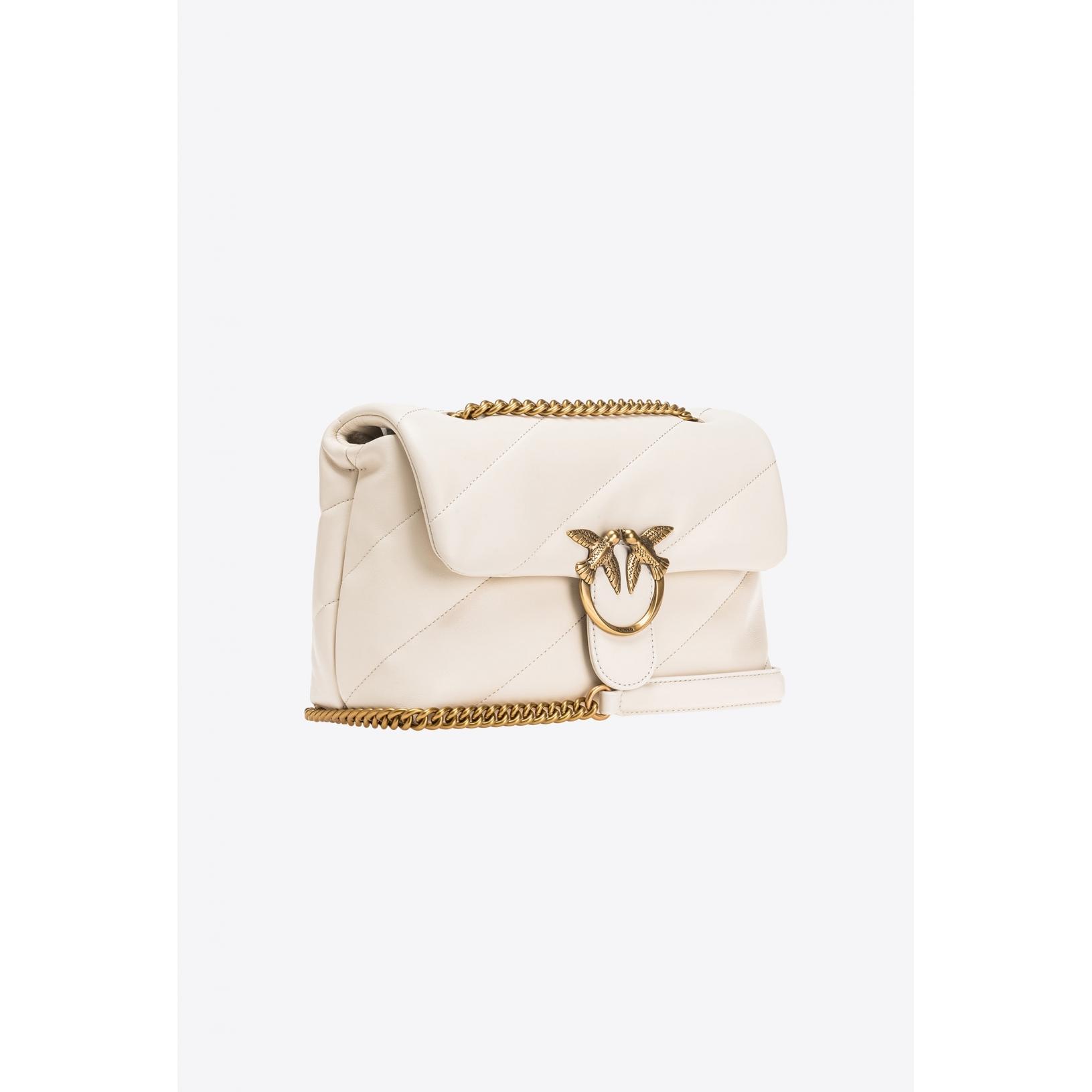 Classic Love Bag Puff in morbida nappa con maxi trapuntatura obliqua. La chiusura è completata dall'iconica fibbia in metallo Love Birds Diamond Cut. L'interno è foderato in microfibra scamosciata e comprende tramezza chiusa con zip e tasca a parete. La tracolla combina la classica catena metallica rotonda al pratico spallaccio in nappa. Attiva la tua borsa PINKO: verifica l'autenticità del tuo prodotto e accedi all'esperienza personalizzata avvicinando il tuo smartphone al ricamo Love Birds che trovi sul retro della borsa! Fodera: NYLON 50% POLIURETANICA 50% - Pelle: PELLE DI PECORA 100% - Accessorio: Zinco 100% Altezza: 19 cm Larghezza: 11 cm Lunghezza: 28 cm