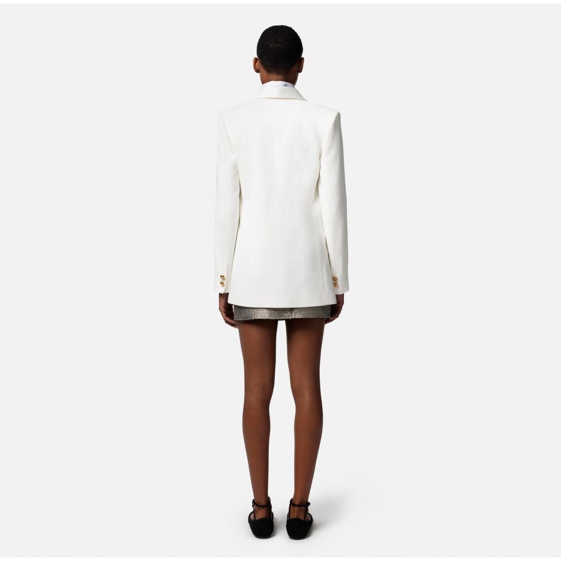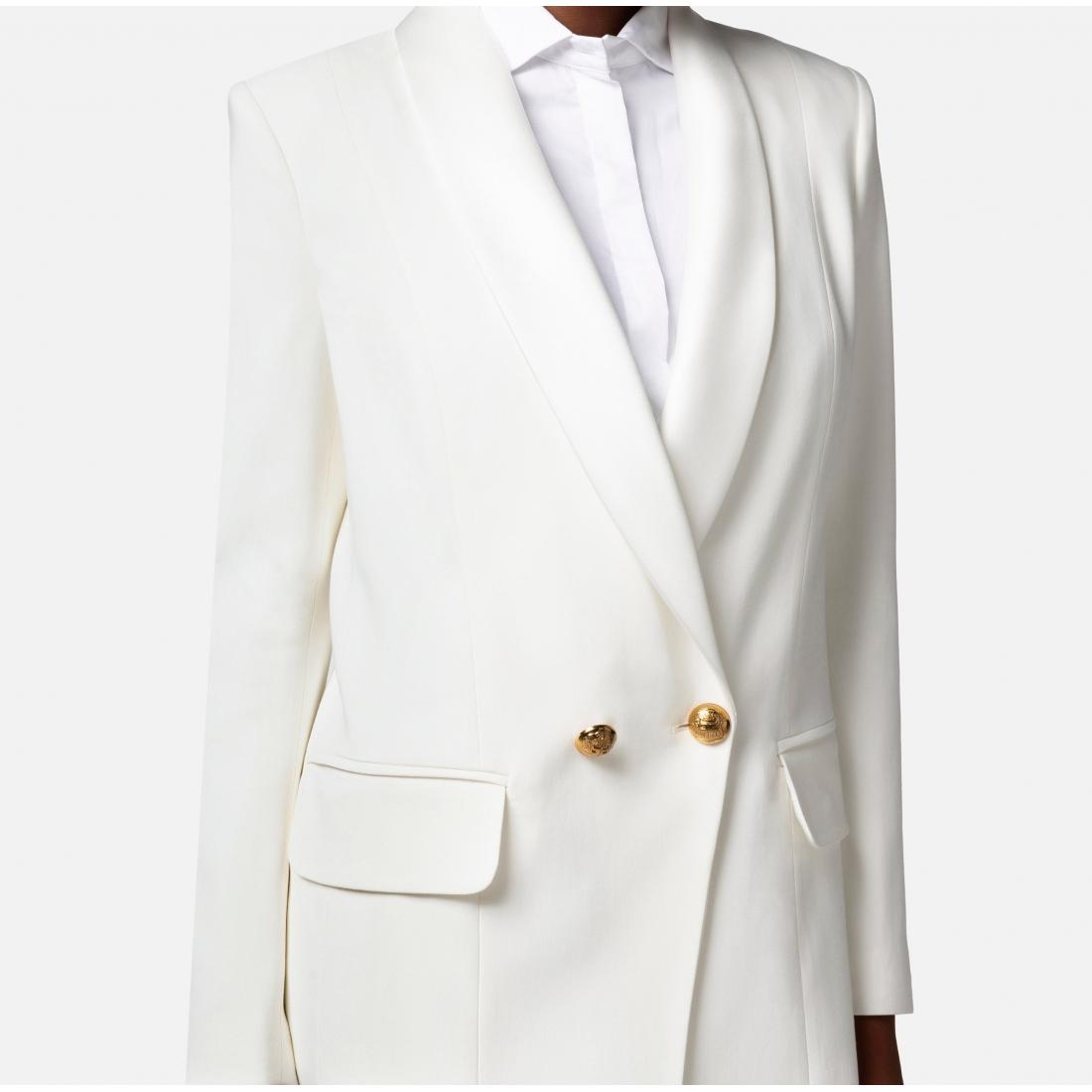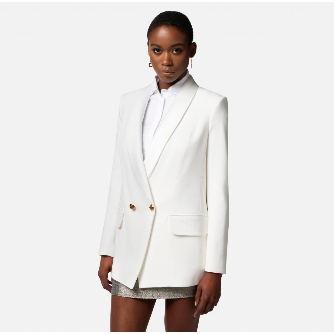 Giacca doppiopetto in gabardina di viscosa stretch con tasche frontali con pattina e filetto. È caratterizzata da revers sciallato in raso duchesse. Fodera in raso monogram Bottoni in metallo dorato Lunghezza 75 cm per la taglia 40 IT La modella è alta 177 cm e indossa una taglia 40 IT Composizione articolo 97% Viscosa 03% Elastane Vestibilità Regular