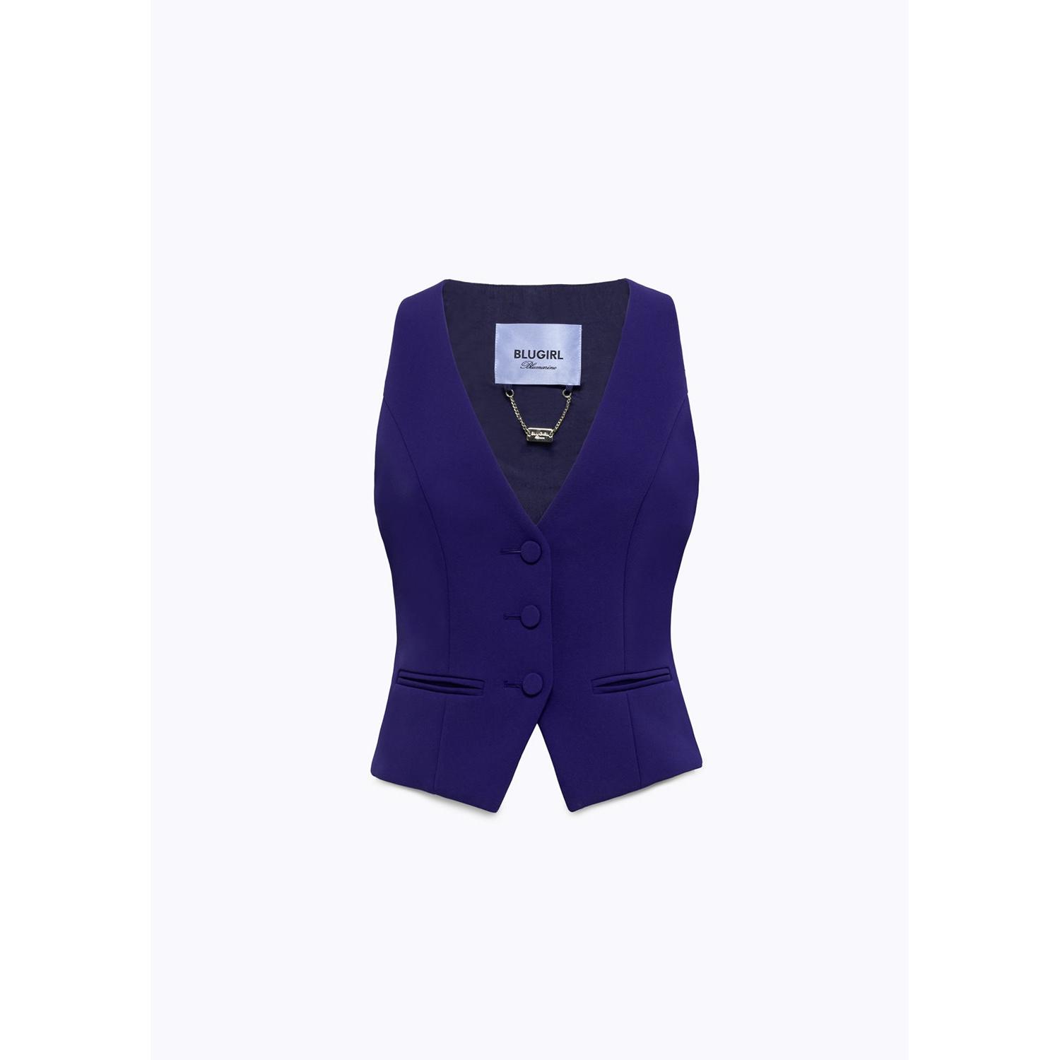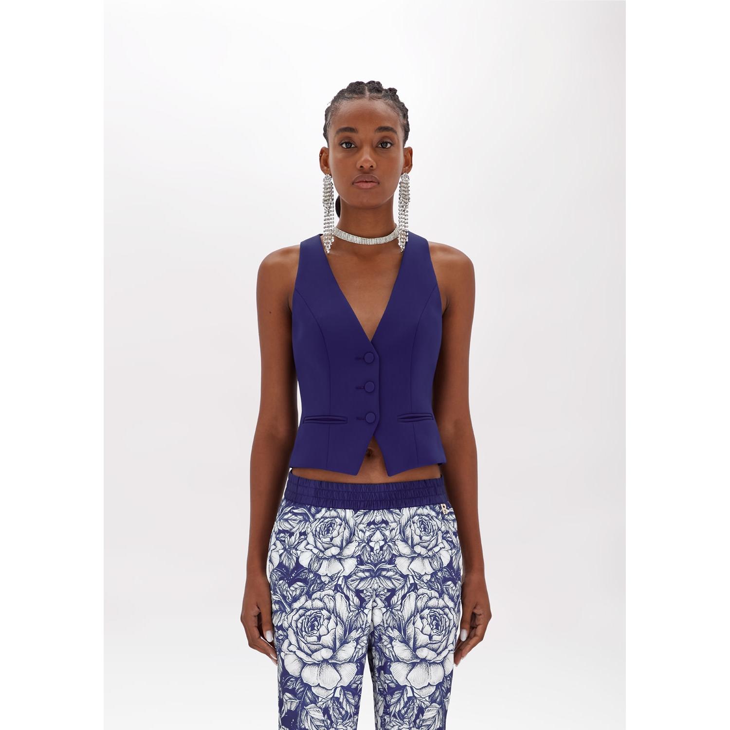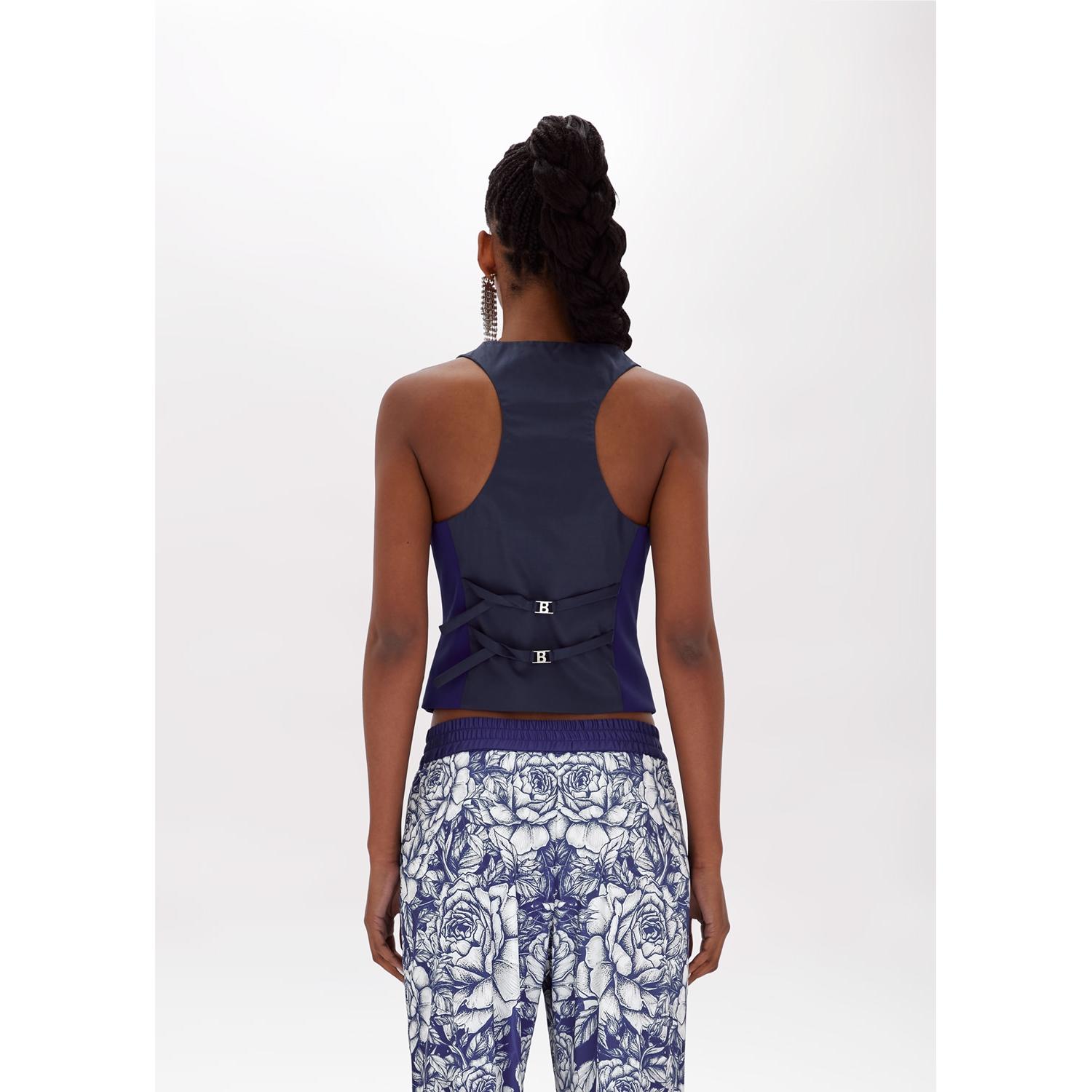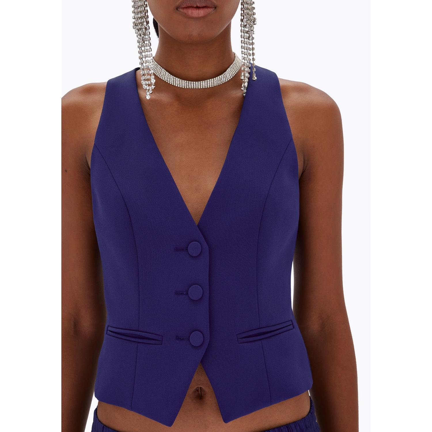 LINEA FITTED PER IL GILET IN CRÊPE STRETCH CON SCOLLO HALTER. CHIUSURA CON BOTTONI RICOPERTI, FINTE TASCHE A FILETTO, FONDO ASIMMETRICO, RETRO IN TESSUTO FODERA CON LACCI E PASSANTE LOGO PER REGOLARE IL FIT. INDOSSALO A PELLE COME TOP UP-TO-DATE PER CATTURARE TUTTI GLI SGUARDI. COMPOSIZIONE: 96% POLIESTERE, 4% ELASTAN.