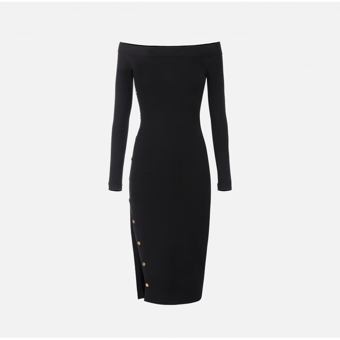 Abito midi in misto viscosa a maniche lunge con scollo a barca. È caratterizzato da una sequenza di bottoni in metallo dorato smaltato lungo lo spacco laterale. Bottoni in metallo dorato smaltato, Lunghezza 120 cm per la taglia 40 IT, La modella è alta 177 cm e indossa una taglia 40 IT, Vestibilità Slim, Composizione articolo, 76% Viscosa 24% Poliestere.